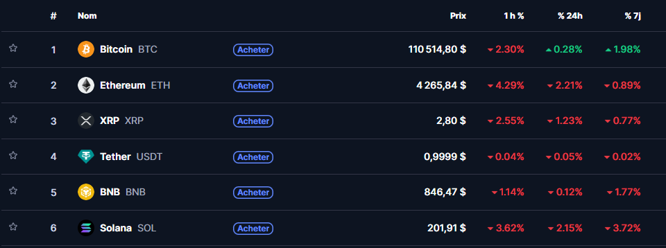 Etrangement, c’est le Bitcoin qui résiste le mieux pour l’instant. Le roi du marché s’est contenté d’un repli de 2,30 %, se maintenant autour de 110 500 $. Une performance qui démontre à nouveau le caractère de valeur refuge du BTC lorsque le marché traverse des turbulences. Mais il souligne aussi la vulnérabilité des altcoins dans un climat de nervosité macroéconomique.