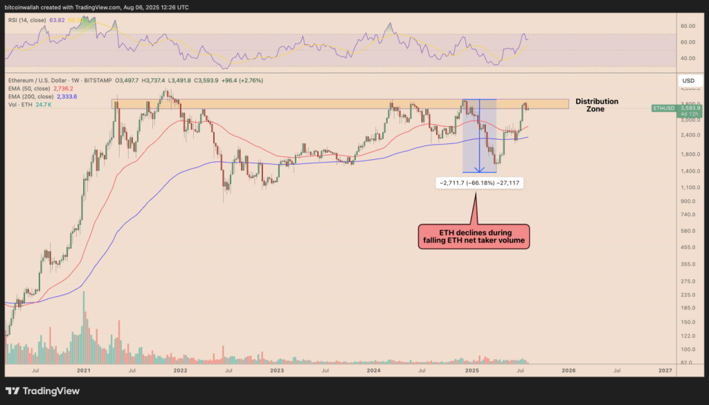 À l’époque, un Net Taker Volume déjà fortement négatif avait précédé une chute de plus de 66 %, renvoyant l’ETH vers ses moyennes mobiles longues. Aujourd’hui, le scénario semble se répéter.