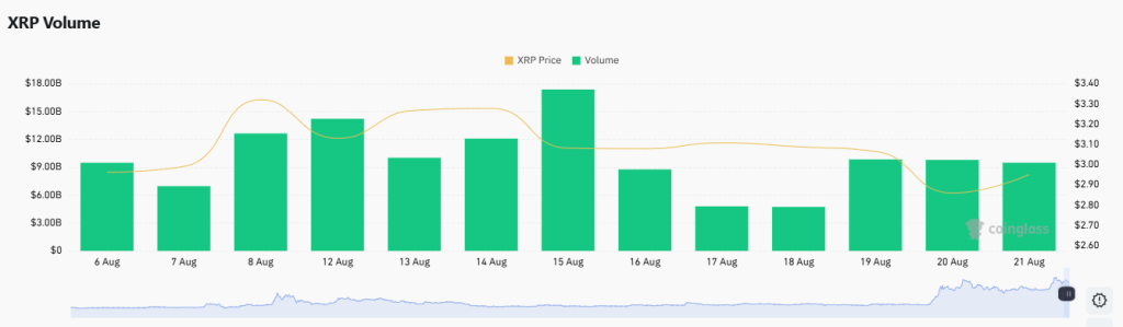 Sur la dernière séance, XRP a oscillé entre 2,84 $ et 2,99 $, avant de se stabiliser autour de 2,90 $. Une poussée la plus nette a eu lieu hier, lorsque le jeton a bondi de 2,84 $ à 2,99 $ en moins d’une heure, porté par plus de 80 millions de volume.