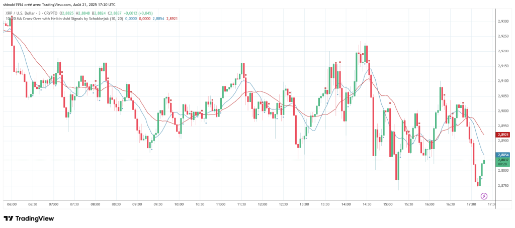 Depuis son dernier rallye, XRP évolue dans un couloir étroit. Les acheteurs tentent de défendre la zone des 2,89–2,93 $, qui a déjà servi de point d’appui à plusieurs reprises. Chaque rebond sur ce support renforce l’idée qu’il s’agit d’une base solide à court terme.