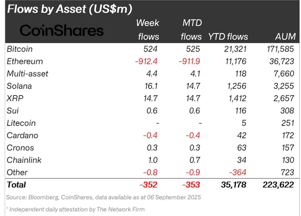En comparaison, Ethereum a connu des sorties massives de 912 M$, ce qui suggère une rotation des fonds vers d’autres altcoins, dont XRP. Bitcoin conserve la plus grosse part avec 524 M$ d’entrées, mais le positionnement de l’Ether montre que l’attention se déplace.