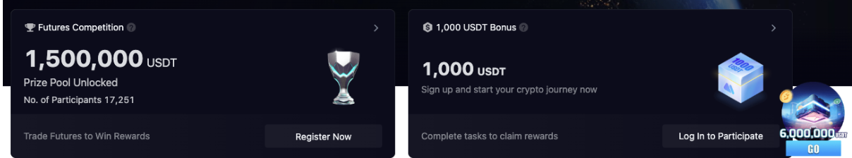 MEXC accueille les nouveaux utilisateurs avec un bonus pouvant atteindre 1 000 USDT, réparti en plusieurs tâches destinées à familiariser les utilisateurs avec la plateforme. De plus, les compétitions mensuelles régulières offrent la chance de gagner des prix, en fonction de votre volume de trading et de votre performance.