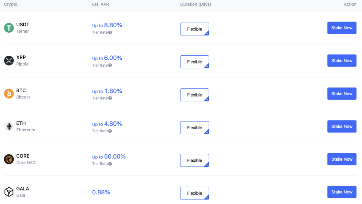 MEXC offre une variété de produits de staking incluant des cryptos populaires comme USDT, BTC, ETH, et d’autres altcoins. Les taux de rendement annuels (APY) varient en fonction de la crypto-monnaie et du type de produit de staking choisi. Par exemple, le staking de DeFi sur MEXC peut offrir des taux allant jusqu’à 8.8% APY pour certaines cryptos.