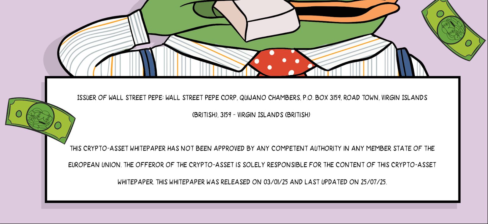 Wall Street Pepe (WEPE) est un memecoin, c’est-à-dire une cryptomonnaie créée autour de plusieurs mèmes internet. Ici, il y a d’une part Pepe the Frog (créée par Matt Furie en 2005) et d’autre part la figure du trader agressif qui brille par ses trades et ses frasques, où l’on reconnaît aisément Gordon Gecko (dans Wall Street, 1987) et Jordan Belfort (dans Le Loup de Wall Street, 2013).