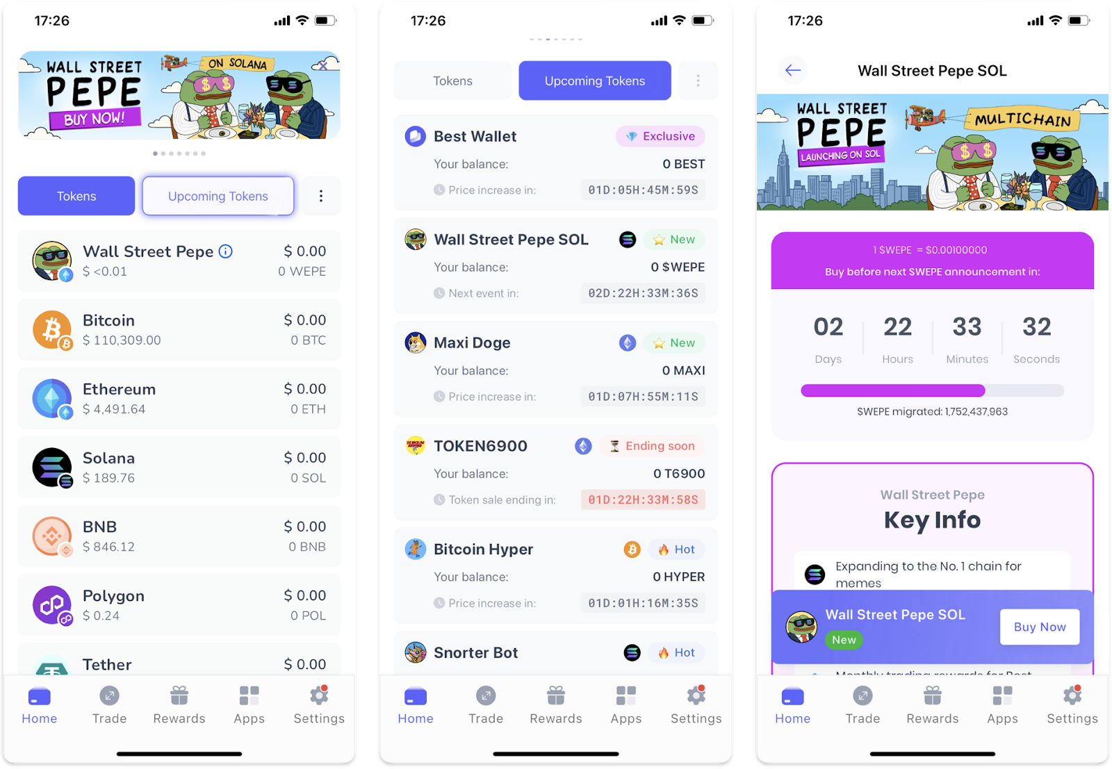 - Soit directement dans le portefeuille mobile Best Wallet : cet excellent portefeuille se connecte automatiquement au réseau de Wall Street Pepe sur Solana, vous payez vos tokens $WEPE par carte bancaire ou en cryptos ETH ou USDT que vous détenez déjà sur le portefeuille.