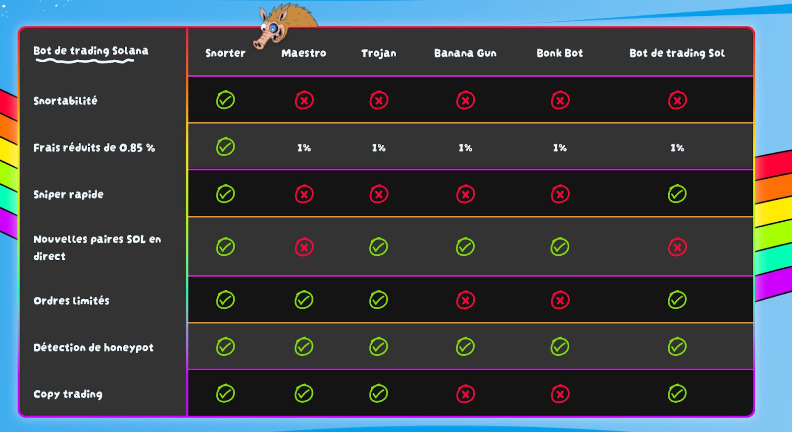 Snorter arrive sur un marché mature et déjà très actif. Sa proposition est simple mais puissante : pourquoi payer plus cher en frais de trading pour acheter et vendre les meme coins sur Solana ? C’est pragmatique, et les fonctionnalités proposées sont solides.