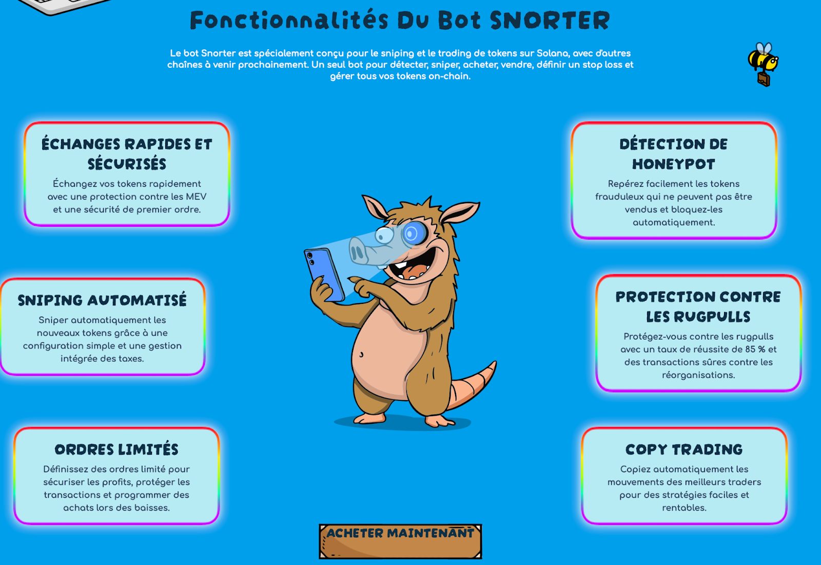 Le plafond à 1,24$ mise sur une exécution plus réussie. Les fonctionnalités phares séduisent massivement. Le “sniping” sur Raydium devient viral : imaginez détecter et acheter automatiquement le prochain BONK dans la seconde de sa création grâce à Snorter.