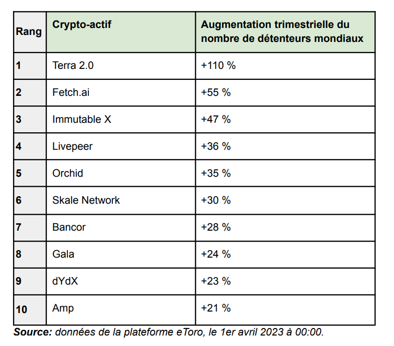Tableau 2 : Crypto-actifs ayant connu la plus forte augmentation trimestrielle proportionnellement au nombre de détenteurs mondiaux sur la plateforme eToro