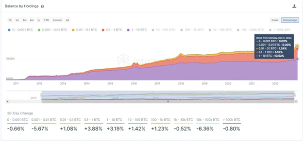 Dans le même ordre, selon un récent rapport de la firme d’analyse Glassnode, environ 17 % de l’offre totale de bitcoins en circulation est désormais détenue par des investisseurs individuels. «Pas encore parfait, mais solide pour un actif de 12 ans et définitivement orienté dans la bonne direction», a tweeté Will Clemente, analyste chez Reflexivity Research, en réponse aux données. «L’offre de bitcoin se disperse au fil du temps». Un graphique de Glassnode partagé par Clemente montre que le pourcentage de l’offre de bitcoins détenu par les investisseurs particuliers est en hausse constante depuis 2011. Glassnode définit le terme «particulier» comme la détention de moins de 10 BTC dans un portefeuille.