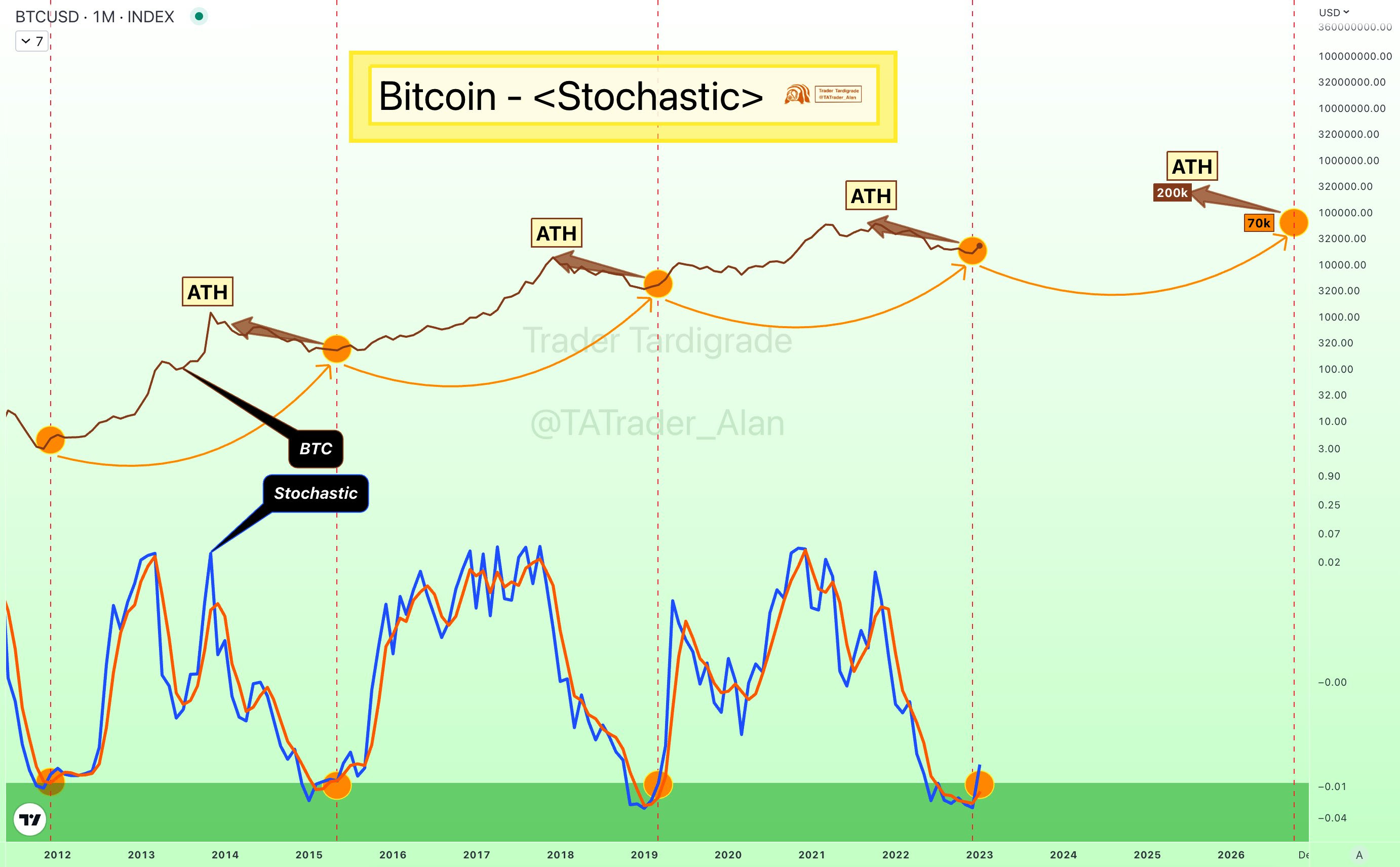 Des analystes tentent par le fait même d’utiliser les données historiques de ces cycles afin de prévoir à quoi pourrait ressembler le prochain marché haussier. C’est l’exercice qui a été mené par le spéculateur « TardiGrade » en utilisant l’oscillateur stochastique du bitcoin, qui se synchronise avec les hauts et les bas du cycle du BTC/USD. Actuellement, l’indicateur imprime son dernier creux, et si l’histoire est un guide, le comportement des prix fera de même. L’oscillateur stochastique est un outil de volatilité, qui compare les prix de clôture aux moyennes historiques. «La structure bien formée du bitcoin avec un comportement stochastique indique que le prochain sommet sera à 200K et le prochain plancher sera à 70K, résume l’analyste à côté d’un graphique illustratif.