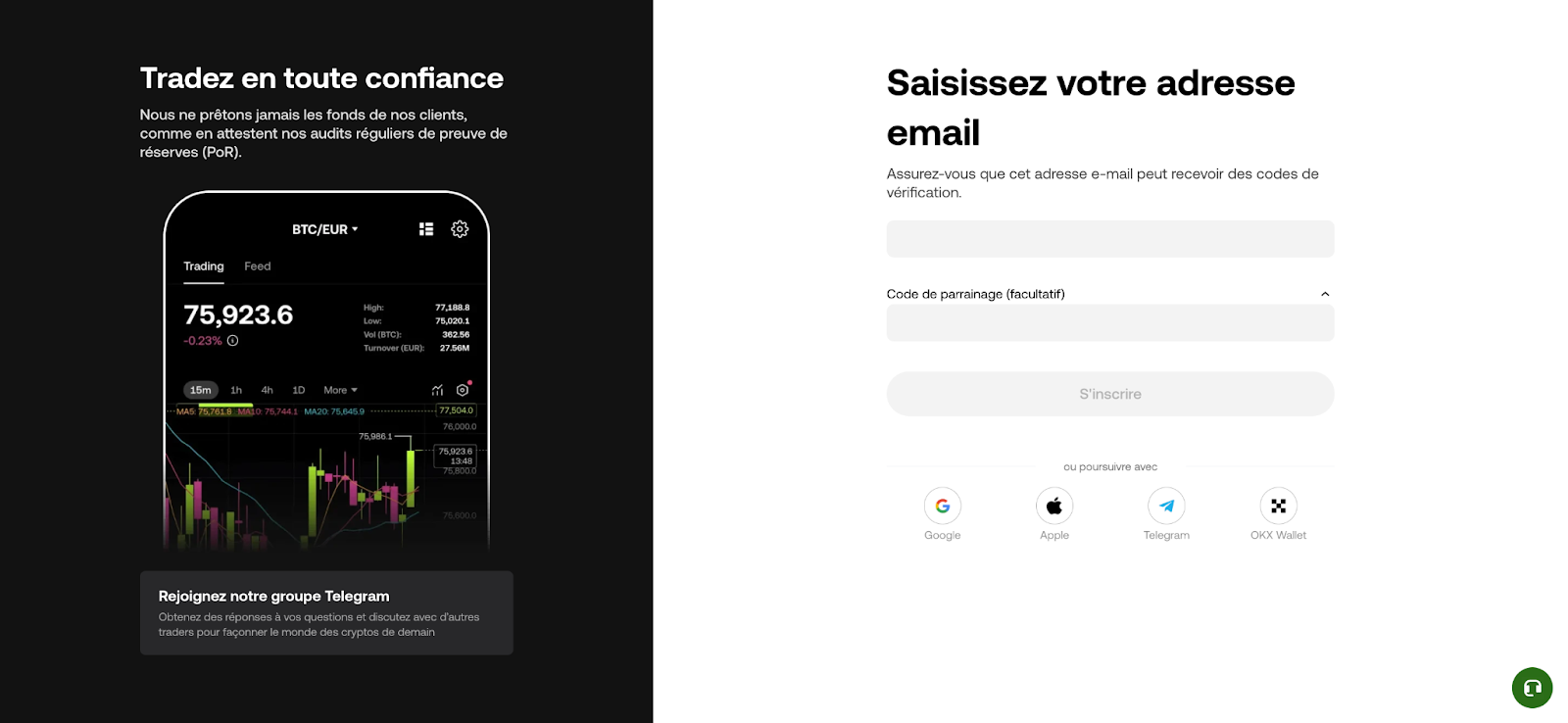 Inscrivez-vous sur l’application iOS ou Android ou sur le site OKX via ce lien officiel en utilisant votre adresse email ou numéro de téléphone.