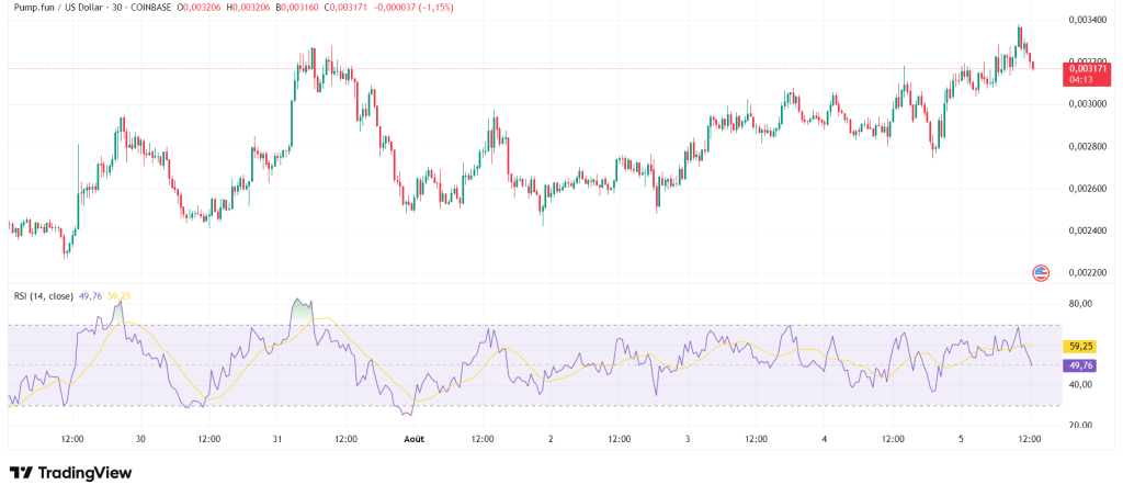 La journée du 5 août marque un tournant pour $PUMP. Après plusieurs jours de consolidation, le token a franchi une résistance importante. Il s’échange autour de 0,00319 $, avec une croissance continue depuis 48h. La dynamique est soutenue par des volumes en forte hausse et un intérêt renouvelé des traders.