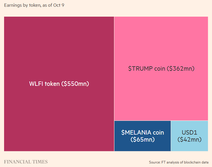 Mais l’empire Trump ne s’arrête pas à la finance décentralisée. Le clan a aussi surfé sur la vague des memecoins en lançant deux jetons officiels : TRUMP ($TRUMP), coté autour de 5,95 $, et MELANIA ($MELANIA), à 0,11 $. Ensemble, ils ont rapporté plus de 420 millions $ via les ventes et les frais de transaction.
