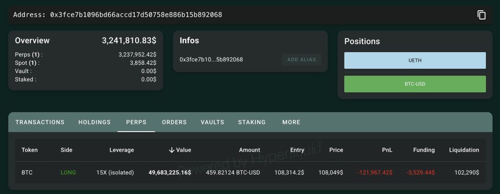 Selon Lookonchain, trois baleines ont récemment déposé plusieurs dizaines de millions de dollars sur la plateforme Hyperliquid pour ouvrir des positions Long à effet de levier. Parmi elles, le portefeuille 0x3fce détient à lui seul une position de 49,7 millions de dollars. Ce regain d’activité témoigne d’un retour de la confiance dans la dynamique haussière.