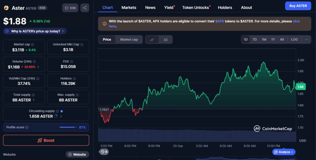 Le buzz est tel qu’on surnomme déjà Aster « le DEX favori de CZ », puisque l’ancien patron de Binance a publiquement salué le projet et annoncé être un « conseiller » de l’équipe. Résultat : une crédibilité immédiate et un afflux massif de capitaux.