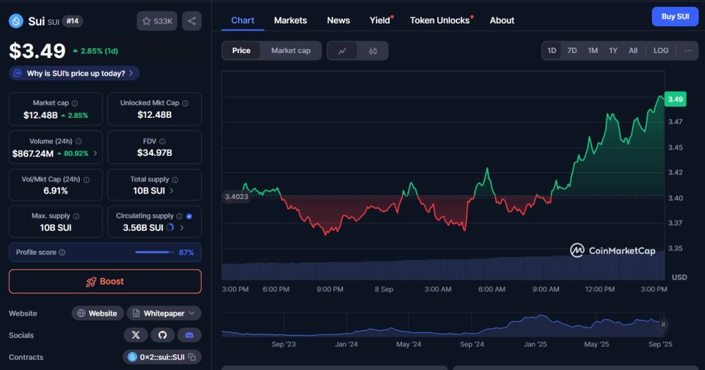 Aujourd’hui, il revient fort : le token est à 3,49 $ (+2,85 % en 24h) et surtout, les volumes explosent (+80 % en une journée). Le marché semble redécouvrir le potentiel de cette blockchain ultra rapide, pensée pour les apps Web3 et les jeux.