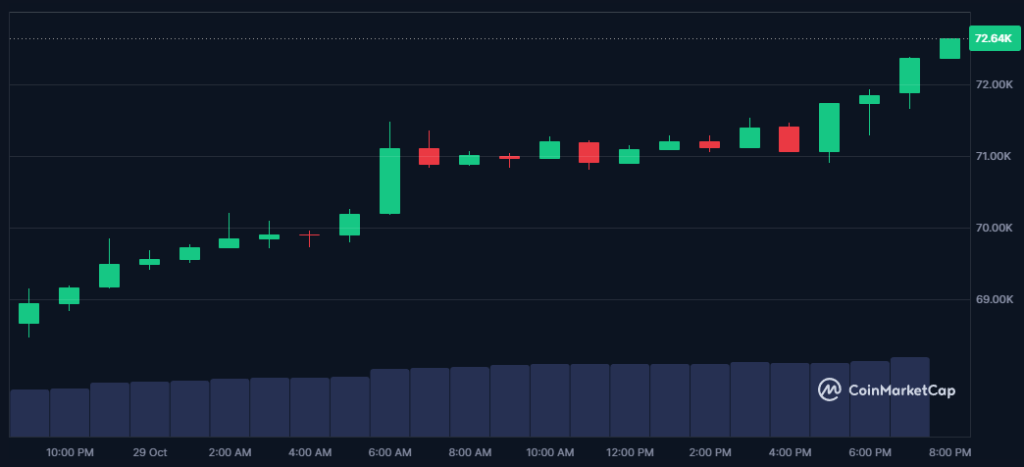 Après avoir verrouillé une clôture journalière au-dessus de 69 000 $ la nuit dernière, le BTC a franchi aujourd’hui un seuil critique à 71 000 $ qui confirme la dynamique haussière amorcée ces dernières semaines.