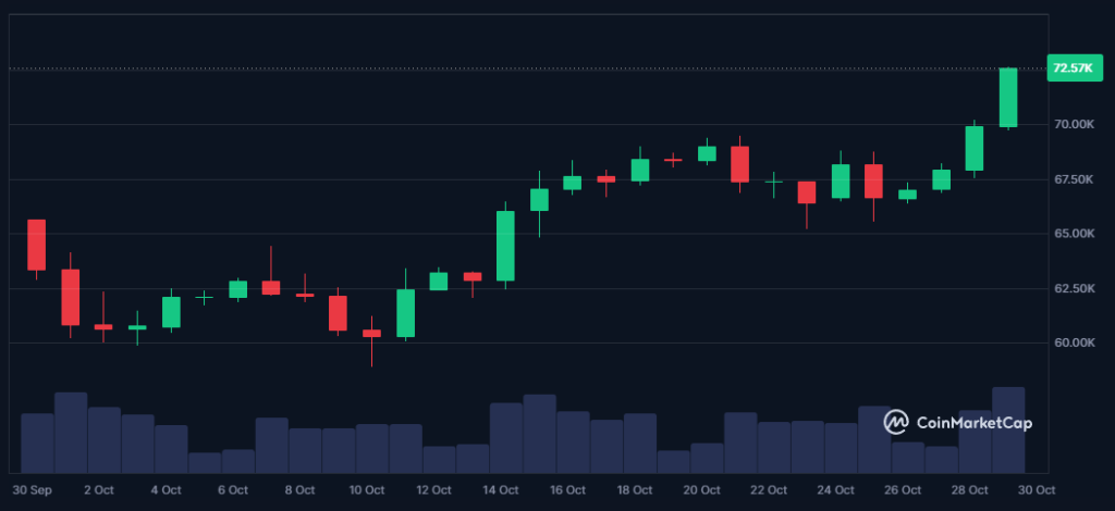 La question est de savoir si cette expansion portera le BTC au-delà des 73 800 $, son dernier ATH de mars, ou si elle servira de prélude à une correction passagère.