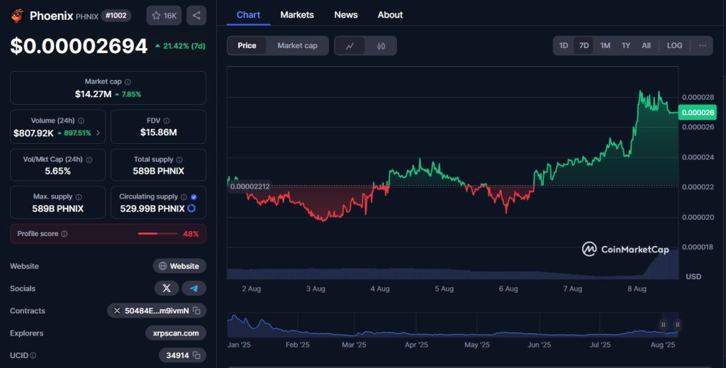 PHNIX, c’est le token qui veut renaître de ses cendres… et faire grimper son prix avec lui. Actuellement entre 0,000025 $ et 0,000030 $, il affiche une capitalisation de 14 millions $. Avec plus de 530 milliards de tokens déjà en circulation, on est clairement sur une micro-cap au potentiel explosif… ou au risque tout aussi fort.