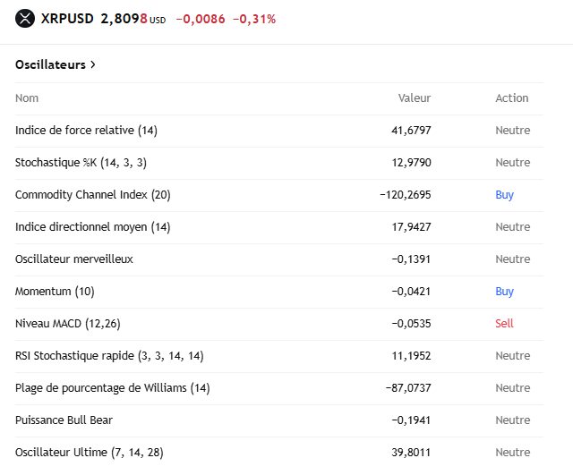 Le XRP a connu une secousse marquée cette fin de semaine. Le prix est passé de 3,02 $ à 2,89 $, soit une baisse de 4,3 % en 24 heures. La chute a même touché un creux à 2,77 $ avant que le support des 2,85–2,86 $ ne s’impose. Le rebond a ramené la paire autour des 2,89 $, confirmant que la zone reste défendue par les acheteurs.