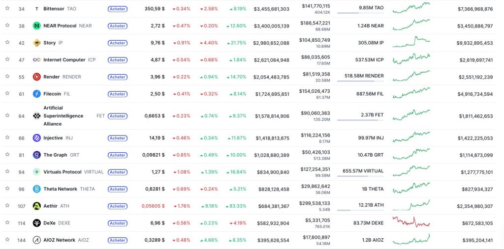 Cela prend place alors qu’en parallèle, les agents IA n’ont jamais été aussi nombreux dans le Web 3. Ce 12 septembre, le marché de l’intelligence artificielle est valorisé à hauteur de 34 milliards de dollars, marquant une hausse de 34 % sur les trente derniers jours selon les données rapportées par Coinmarketcap.