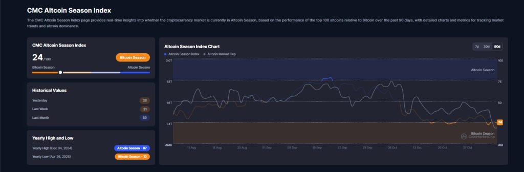Vous connaissez peut-être l’Altcoin Season Index. Et pour qu’on parle de vraie “altseason”, il faut dépasser 75 sur 100. Or, depuis des semaines, on stagne autour de 25. Autrement dit : on est encore loin d’un retour en force des alts.