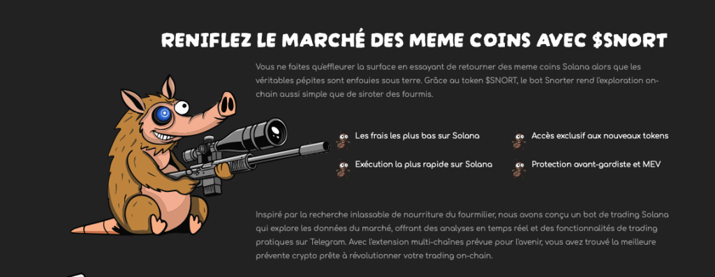 Snorter est donc le projet idéal pour s’exposer à cette narrative. Proposant un bot de trading efficace avec de nombreuses fonctionnalités : protection Honeypot et MEV Bot, transactions instantanées et frais réduits, son architecture est idéale pour le trading de memecoin.