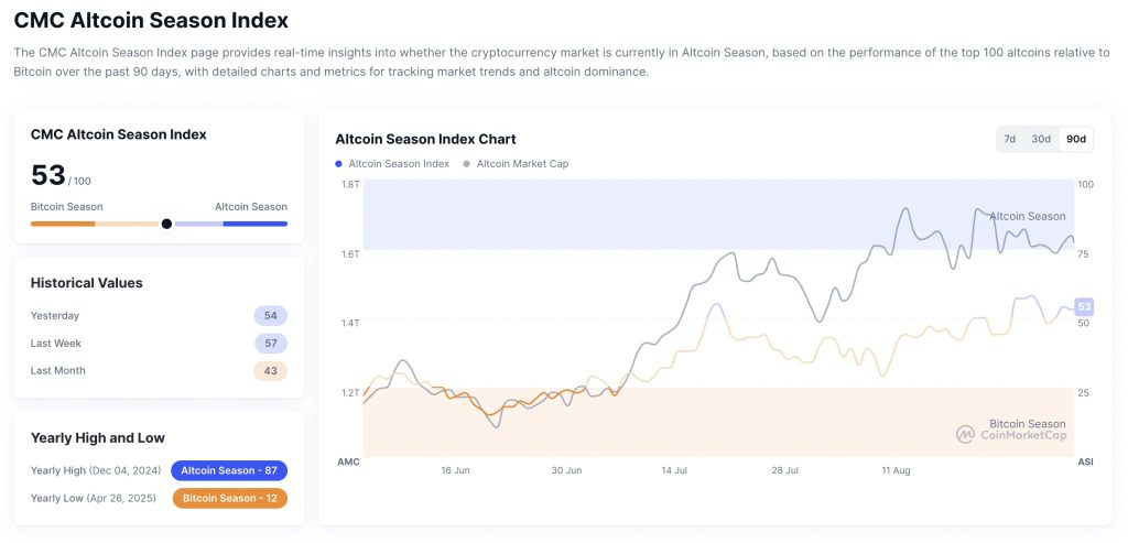 L’Altcoin Season Index est passé de 43 le mois dernier à 53 aujourd’hui, selon CoinMarketCap. Un passage au-dessus de 75 est une altseason confirmée.