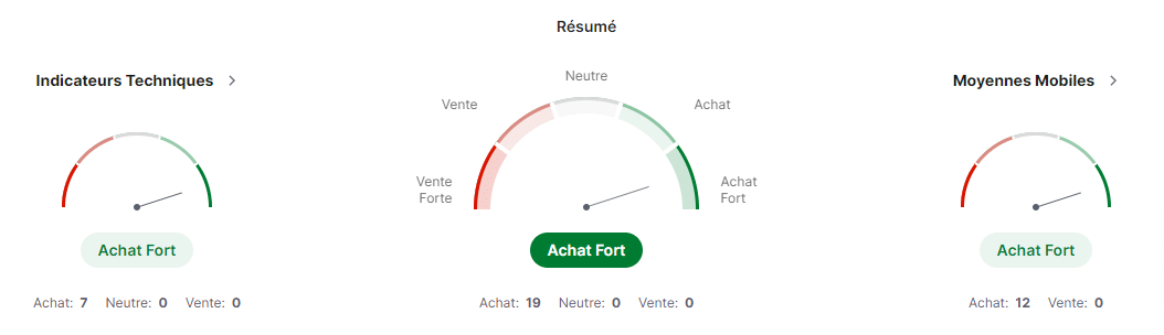 L’analyse hebdomadaire des indicateurs techniques pour Kaspa (KAS) révèle une tendance majoritairement positive. Les signaux favorisent nettement l’achat, avec 7 indications en ce sens et aucune recommandation de vente ou neutre. Cette perspective optimiste est soutenue par les moyennes mobiles, qui confirment unanimement la tendance à l’achat sur 12 indicateurs analysés. Les données reflètent un sentiment haussier parmi les investisseurs, soulignant le potentiel de Kaspa dans le marché actuel des cryptomonnaies.