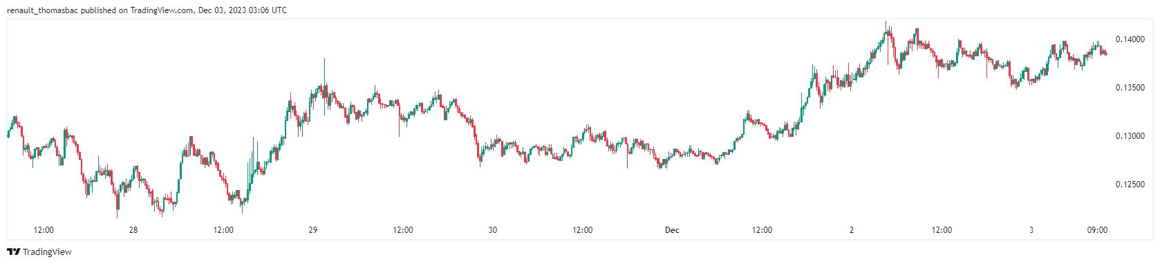 Depuis le 1ᵉʳ novembre, le graphique journalier de la paire KAS/USDT révèle une séquence de trois bougies vertes consécutives. Actuellement, le prix se négocie à 0,138$, ramenant Kaspa au-dessus de 0,13$ et l’orientant vers la prochaine résistance à 0,15$. Cette progression intervient après une légère correction survenue fin novembre. Dans la dernière journée, Kaspa a enregistré une hausse de 1,13%, signalant un regain d’intérêt des investisseurs.