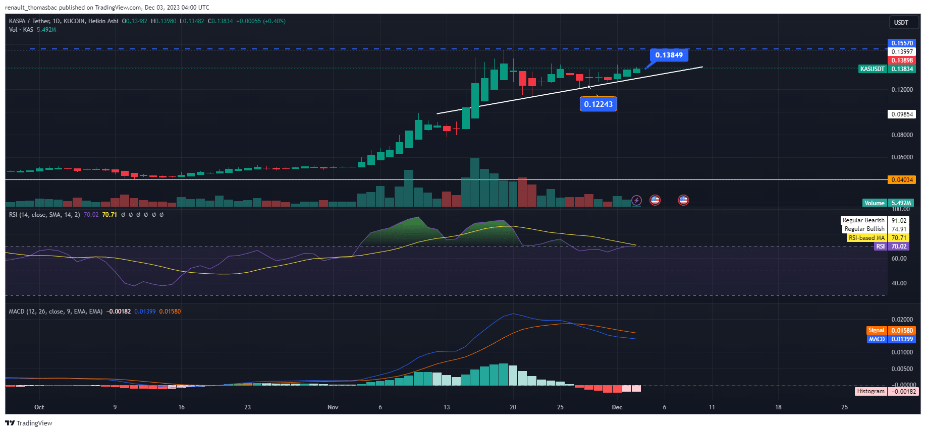 Au cours de la dernière semaine, le prix de Kaspa (KAS) a connu une hausse modérée de 1,06 %, fluctuant entre 0,122$ et 0,141$. Le cours a rencontré une résistance autour de 0,14$, un seuil qu’il a réussi à franchir, mais une correction est vite survenue. Le support immédiat pour Kaspa se trouve à 0,109$, tandis que le prochain niveau de résistance significatif est à 0,15$. Ce dernier a été atteint le 20 novembre, mais a ensuite subi un retracement, ramenant le prix à 0,11 $.