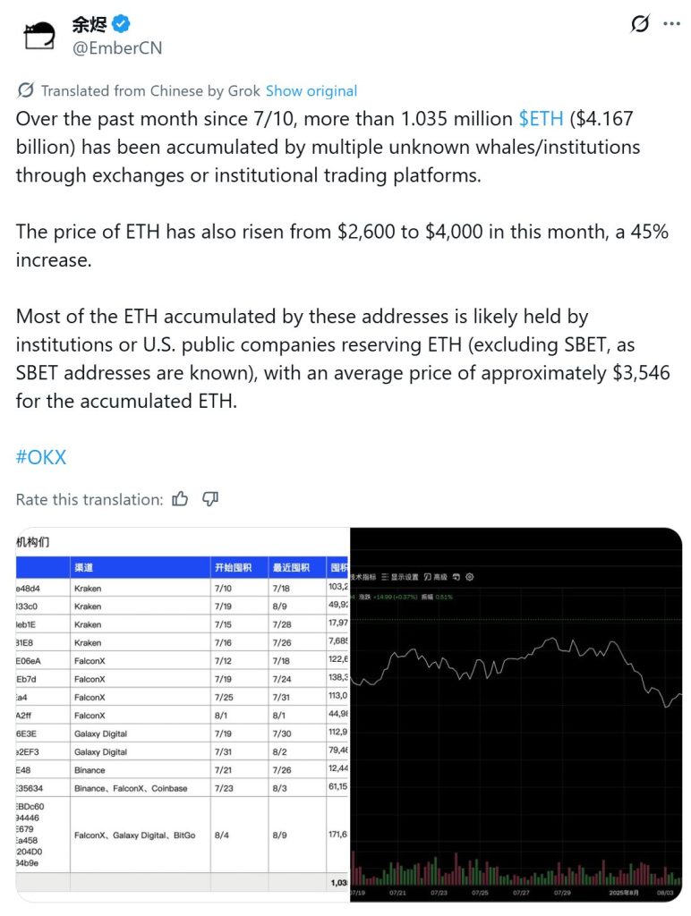Ce revirement intervient dans un contexte de forte accumulation institutionnelle sur Ethereum. Depuis le 10 juillet, plus d’1,035 million d’ETH, soit à peu près 4,17 milliards de dollars, ont été achetés via des plateformes d’échange et de trading institutionnel, selon les données d’EmberCN.