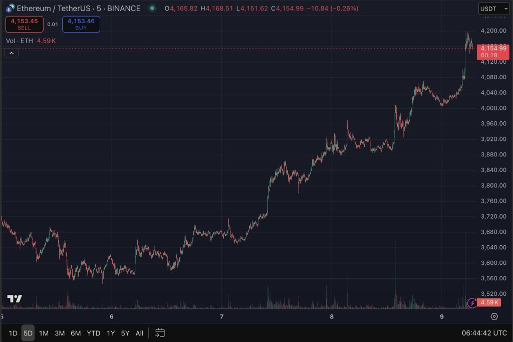 Ces achats, attribués à des baleines et à des sociétés cotées américaines, excluent les entités dont les adresses sont déjà connues, comme SBET. Le prix d’acquisition moyen se situerait autour de 3 546 $ par unité. L’impressionnante envolée de l’ETH +45 % sur un mois, passant de 2 600 $ à plus de 4 000 $ vient également de ce fait.