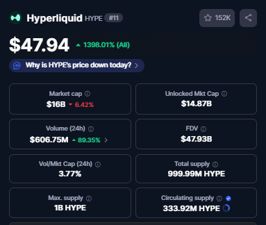 Le token HYPE, adossé à Hyperliquid, plateforme décentralisée de produits dérivés, reste l’un des plus performants de l’année. Lancé en novembre dernier à 6,51 $, il cote aujourd’hui autour de 49,48 $, malgré un repli de près de 8 % sur 24 heures. En d’autres mots, Hype aura progressé de plus de 1 300 % depuis son lancement.