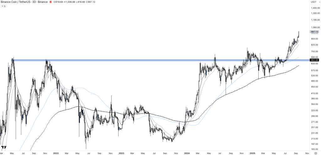 Avec l’intérêt progressif des spéculateurs et traders pour Aster, un produit originaire de la BSC et soutenu par Yzi Labs, cela devrait directement bénéficier à l’ensemble de l’écosystème Binance. Bien que cela ne soit pas le seul vecteur, nous pouvons constater une très forte expansion du BNB. En effet, il a dépassé ce jeudi 18 septembre les 1 000 dollars. Un niveau historique.