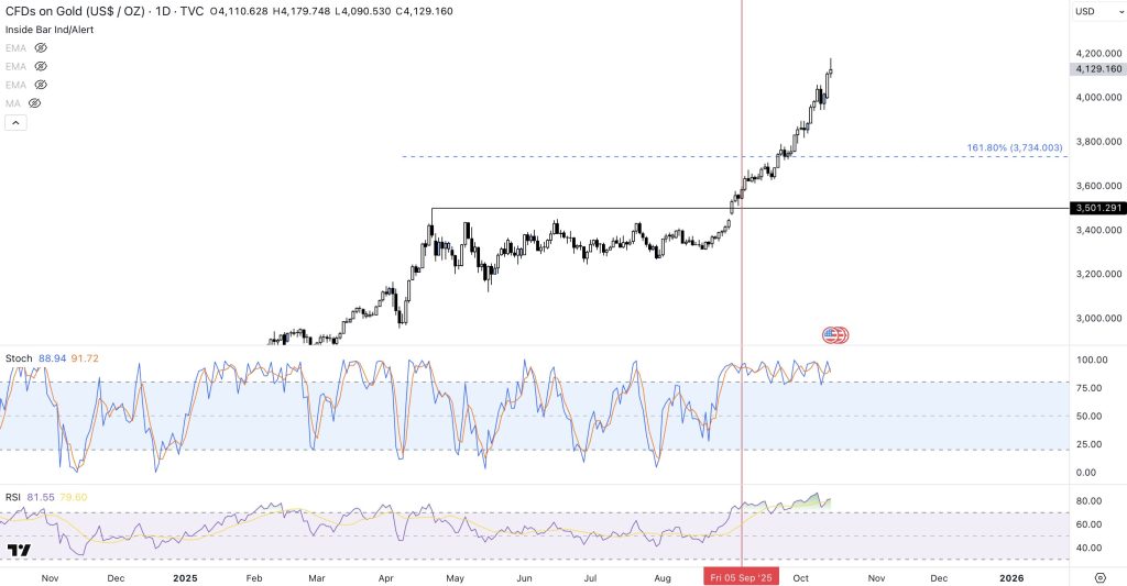 Cette confluence d’éléments portent l’or en découverte de prix. Avec une hausse de 20 % depuis le mois de septembre, ne serait-ce pas trop brutal ? En analysant les données du RSI (plus de 91) et le stochastic (autour des 96), les indicateurs sont en surchauffe. D’ici la fin d’année, l’or pourrait marquer son point culminant avant de corriger sous les 4 000 dollars.
