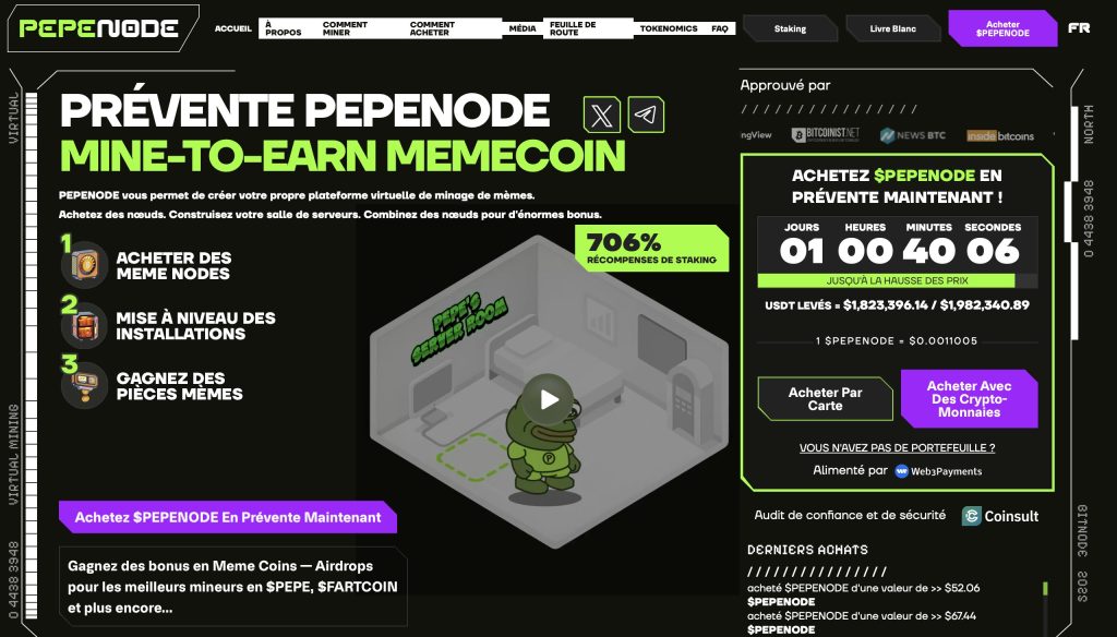 Développé sur ethereum et toujours en prévente, Pepenode permet de réaliser virtuellement du minage en contrepartie de rendements (airdrops) en memecoins : PEPE, Fartcoin et bien plus encore. Apportant un accès simplifié au monde du minage, ce memecoin qui repose sur la tendance des PEPE dispose d’un fort potentiel. À ce jour, près de deux millions de dollars ont été levés. Alors, qu’attendez-vous pour le découvrir ?