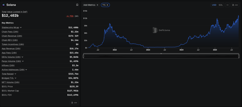 Quant aux données on-chain, elles sont très encourageantes. D’après DeFiLlama, Solana a marqué de nouveaux sommets avec une TVL dépassant les 12 milliards de dollars pour la première fois de son histoire.