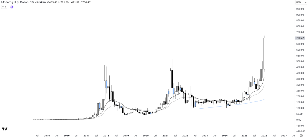 Selon les principaux agrégateurs, XMR a inscrit un sommet autour de 716 $ le 14 janvier 2026, effaçant largement son précédent pic de 2018. Dans le même temps, la dynamique est tout sauf marginale avec une hausse qui dépasse les 45 % sur la semaine, se positionnant dans les meilleurs actifs en matière de capitalisation.