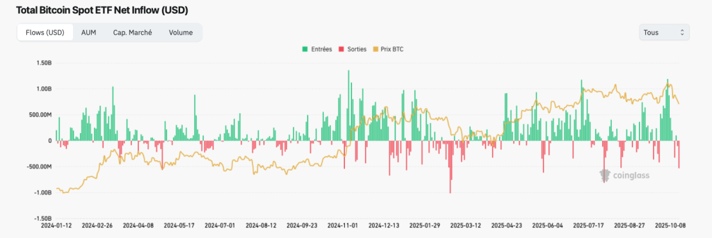 Bitcoin accuse le coup. D’après les données sur Coinglass, les ETF spot BTC ont marqué 530 millions de dollars de sorties. Une situation accentuant la pression vendeuse, expliquant la baisse de ces dernières 24 heures.