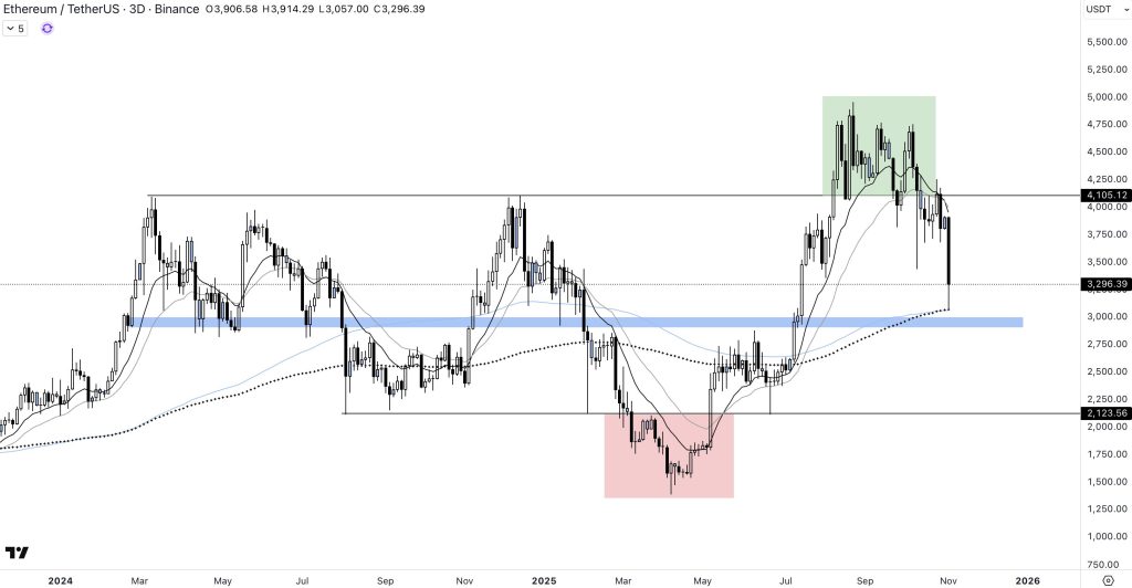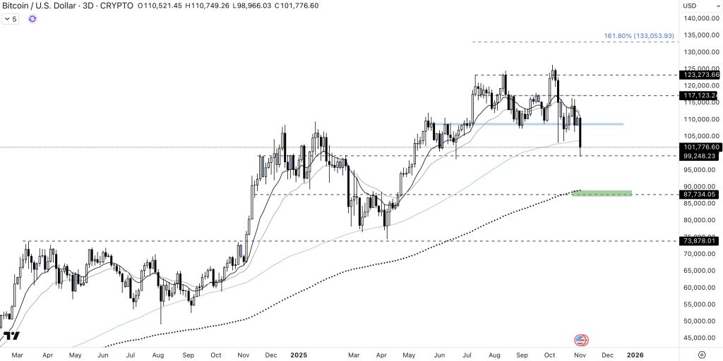 Malgré des perspectives réglementaires favorables aux États-Unis, ainsi qu’un potentiel ETF BTC spot en Australie, le roi des cryptomonnaies n’est pas en capacité de regagner le pivot à plus de 110 000 dollars. Résultat ? Le cours accentue sa baisse, se retrouvant autour des 100 000 dollars. Ce que l’on constate, c’est un passage sous l’EMA 200 1D ainsi que la MA 100 3D. En perdant ces moyennes mobiles en HTF, les signaux convergent vers un seul scénario : une baisse prolongée du marché durant les prochains mois.