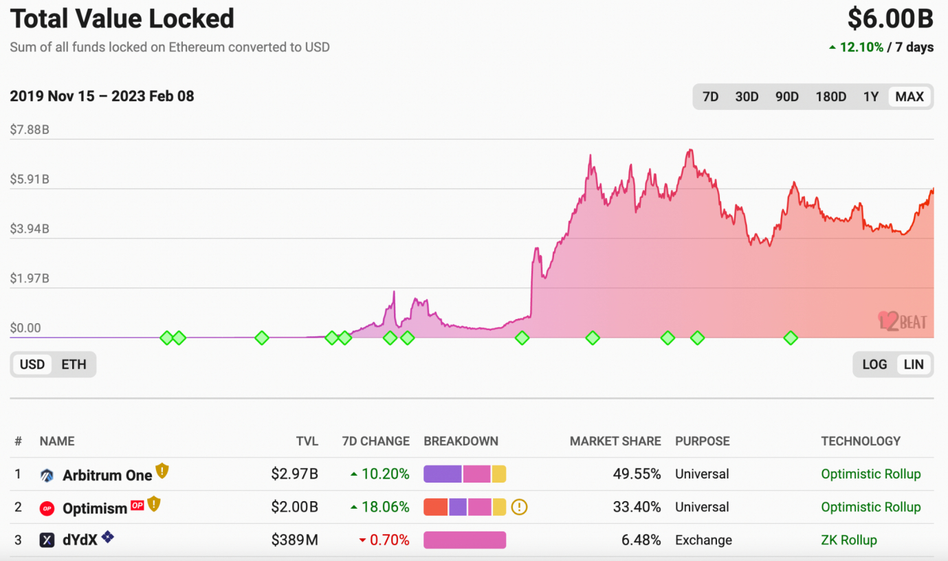 Selon L2beat, en tant que solution de mise à l’échelle d’Ethereum très attendue, Arbitrum occupera bientôt 50 % de la TVL totale de l’ensemble du marché L2, tout cela grâce à son incroyable écosystème.