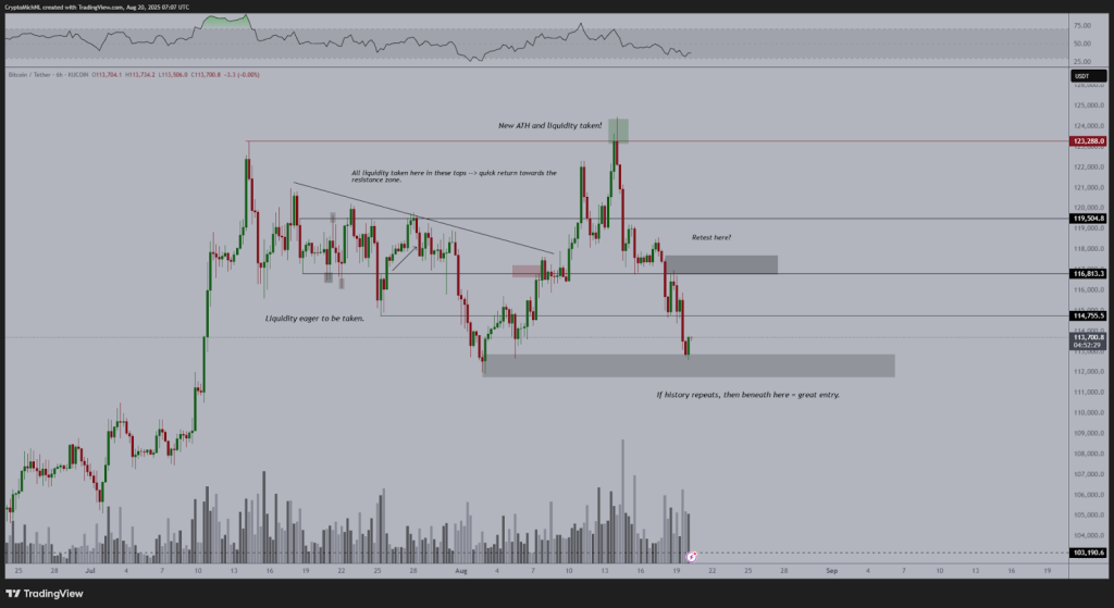 Après une chute rapide à 112 380 $ suivi d’un redressement à 114 000 $, le Bitcoin continue d’envoyer des signaux mitigés. Mais la tendance reste fragile. Depuis la mi-août, la première cryptomonnaie recule, entraînée par la faiblesse du marché global. Désormais, le support de 110 000$ se profile avec une dualité saisissante quant à son interprétation.