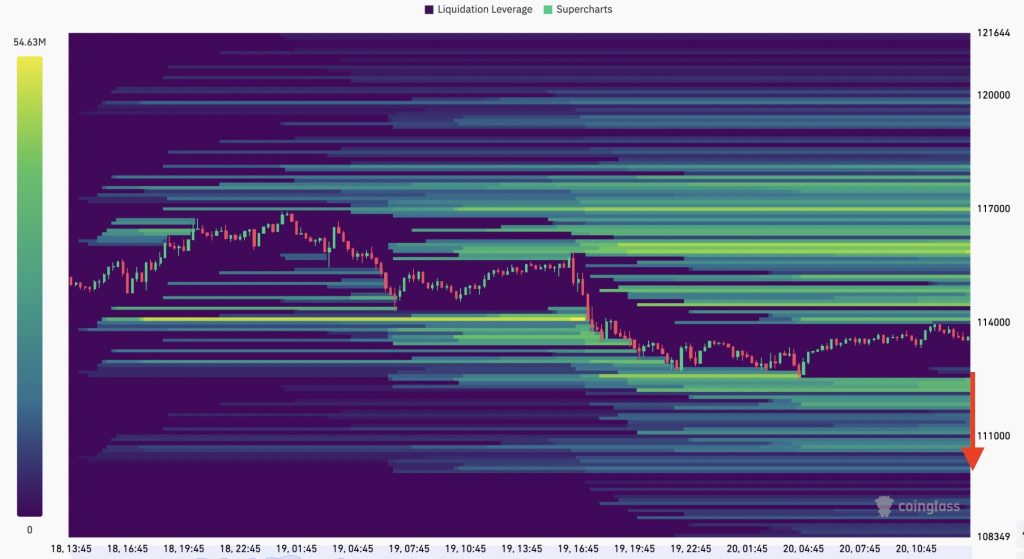 Les données de CoinGlass montrent que l’essentiel des liquidations se concentre entre 115 800 $ et 118 100 $. Si le prix repasse au-dessus de ces niveaux, un short squeeze pourrait propulser le BTC vers 120K, où se trouve un autre cluster de liquidité.