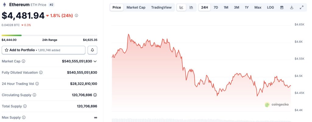 Alors que le bitcoin teste ses limites, Ethereum conserve une dynamique plus solide. L’ether se négocie actuellement autour de 4 476 dollars, après avoir inscrit un plus haut proche de 4 627 dollars au cours des dernières 24 heures.