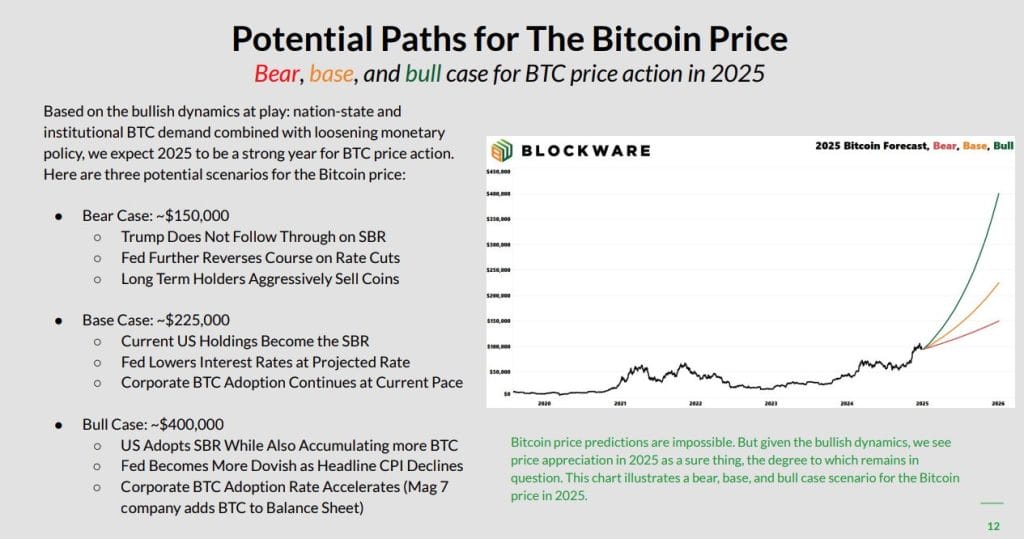 Dans ce même rapport sur les prévisions du marché en 2025, Blockware établit un scénario qui est particulièrement conséquent puisqu’ils estiment que bitcoin pourrait attendre les 400 000 dollars. Cela représenterait une multiplication du cours par quatre en seulement quelques mois.