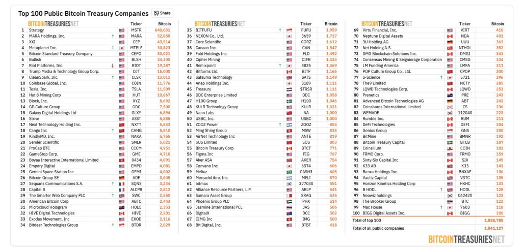 Après un été plus calme, les stratégies de trésorerie bitcoin s’accélèrent, franchissant très nettement la barre du million d’unités détenues. Avec 344 entités différentes qui détiennent du BTC, ce sont trois entreprises américaines qui se positionnent dans le TOP 3 : Strategy, MARA Holdings et XXI. Juste derrière se retrouve l’entreprise japonaise Metaplanet, accélérant également ses acquisitions depuis quelques mois.