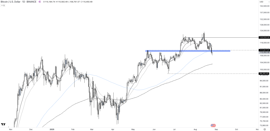Ayant perdu 10 000 dollars, bitcoin évolue désormais autour des 110 000 dollars. Bien qu’il sois sous le support, ce n’est pas encore perdu pour les acheteurs. Le cours est toujours au-dessus des sommets ayant été marqué entre mai et juin dernier.