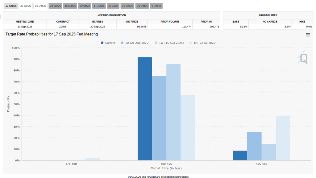 Le véritable enjeu se situe désormais sur la réunion de la Fed en septembre. D’après le CME FedWatch Tool, les marchés tablent de plus en plus sur une réduction de 25 points de base. L’hypothèse d’un maintien des taux, dominante il y a encore deux semaines, s’estompe rapidement.