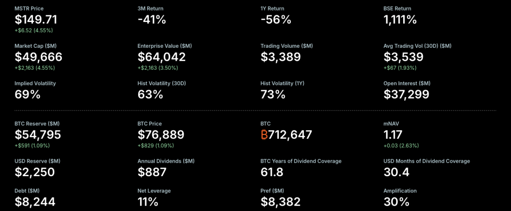 À la date la plus récente publiée sur son tableau de bord, Strategy affiche 712 647 BTC, pour un coût d’acquisition total d’environ 54,188 milliards de dollars et un prix moyen proche de 76 037 $ par BTC. À ces niveaux de marché, la valeur de la position est proche du point mort, ce qui limite, pour l’instant, le risque d’un choc comptable par rapport au coût.